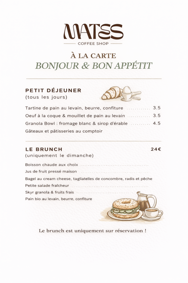 Notre Carte Moccaccino $5.0 Cappuccino $4.5 Espresso $2.0 Flat White $4.5 Cortado $3.5 Iced Lattè $5.5 Long Black $2.0 Chaï Latte $4.5 Notre Brunch et petit-déjeuner 10,000+ de clients satisfaits 10+ sortes de café 7+ années à vos côtés 1,500+ 5 étoiles